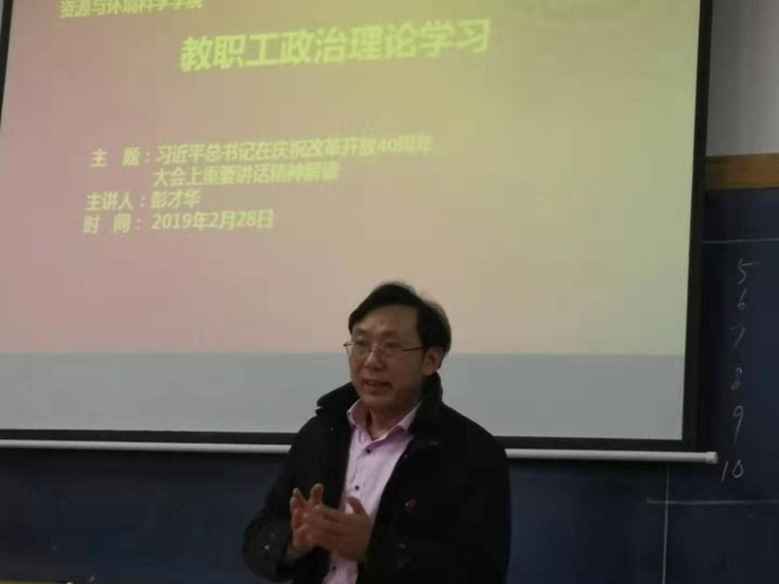 2019年2月28日,资环公司党委在217教室组织全院教职工政治理论学习,主题是学习贯彻习近平总书记在庆祝改革开放40周年大会上的重要讲话精神,会议由经理谢炳庚教授主持,党委书记彭才华同志作专题辅导报告。