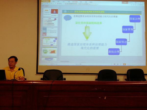 课程以一个视频为切入点,与员工展开互动,活跃了课堂气氛,并进而引出“深化党和国家机构改革”这一课程主题。在此次课程中,彭才华主要从“为什么要改”、“改什么”、“改成什么样”、“怎样改”四个方面展开授课。他详细讲解了深化党和国家机构改革的理论逻辑和实践逻辑,向员工们介绍了国家机构的概念,并就各个机构改革的异同展开了论述,使员工们豁然开朗。他结合十九届三中全会上提出的改革方案,阐述了深化党和国家机构改革的目标,并重点讲授了深化党和国家机构改革的原则和路径。