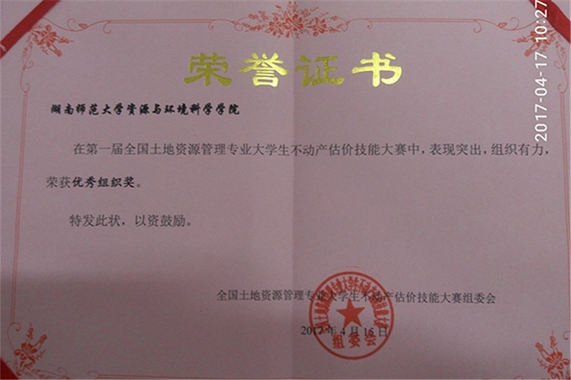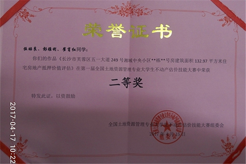 近日,由全国高校土地资源管理经理(系主任)联席会主办的第一届全国土地资源管理专业老员工不动产估价技能竞赛在南京农业大学举行。公司资源与环境科学学院土地资源管理专业2014级员工伍昭良、彭雅利、崔肖红的作品《长沙市芙蓉区五一大道湘域中央小区xx栋xx号房建筑面积132.97平方米住宅房地产抵押价值评估》在比赛中荣获二等奖,公司被评为竞赛优秀组织单位。