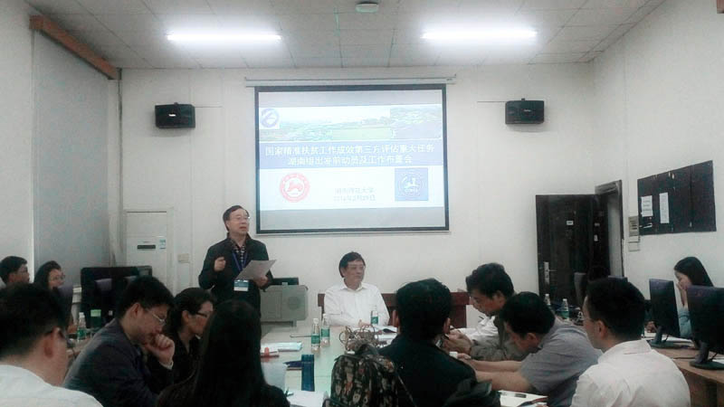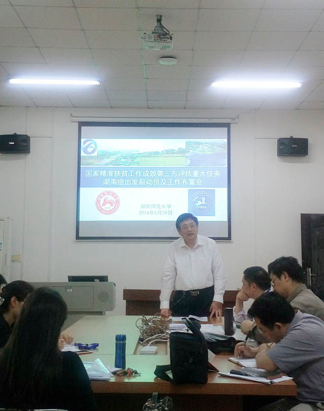 谢炳庚经理做了动员讲话,并对调研工作提出了三点要求:一是要提高认识,充分重视此次评估调研任务,严肃保密纪律,严格遵守相关规定;二是要确保质量,按照规范科学采集调研数据和资料,保证采集数据的客观性和原真性;三是要注意安全,确保调查员的人身和财产安全。朱翔教授对评估工作进行了指导,他概要介绍了贫困地区在全国的地域分布特征,对湖南抽查的6个贫困县进行了简要分析,从因地制宜、特色产业、区域发展等角度出发,强调了精准扶贫要重视造血功能、建立内生机制,并指出了扶贫工作要关注的重点问题及本次调研要注意的重要事项。周国华教授在总结时指出,这次调研作为对湖南精准扶贫工作成效的情况摸底,任务艰巨、意义重大,各小组要克服困难、严守纪律,按照“概念理解精准、政策把握精准、问卷填写精准、过程记录精准、成果录入精准和规定贯彻精准”等六个精准的调研要求,高标准完成此次调研任务。彭鹏副教授、贺艳华副教授就调研出发前的具体工作进行了安排。