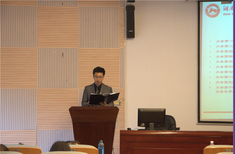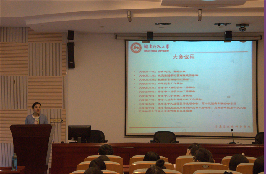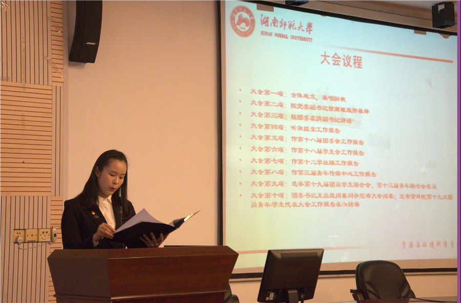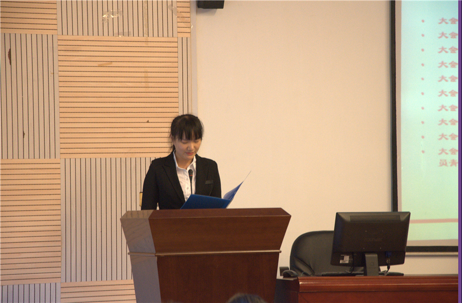 杨惠君宣布大会开始并要求全体起立合唱中华人民共和国国歌。接着,学院团委副书记朱琦至、王圆分别作2015-2016学年度团委工作总结报告并浅谈了工作感受,院员工会主席齐麟、院学社联主席高雅、院青传主任罗俐敏分别作了2015-2016学年度有关部门工作报告,同时也对新一届主席团提出了殷切的希望。随后,朱琦至宣布第十九届团学联合会、第十三届青年联合会换届竞职演讲开始,新一届68位候选人在台上展示了自己的特色,也提出了自己当选后要对部门的规划等等问题。最后,院团委书记王磊作总结讲话。他首先对上一届主席团给予了充分的肯定,并对候选人表示诚挚的祝贺,希望他们能本着“服务同学,奉献自身”的宗旨,怀着强烈的责任心踏踏实实地开展工作,把工作推向新的高度。