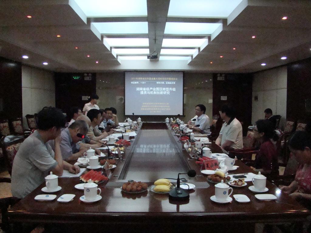 2011年7月5日上午,公司资源与环境科学学院副经理周国华教授主持的湖南省哲学社会科学基金重大招标项目——《湖南省级产业园区转型升级提质与机制创新研究》开题报告会在红楼四楼会议室举行。省社科规划办主任骆辉、副主任王礼生和由省国土资源厅方先知厅长担任专家组组长,湖南商学院柳思维教授、省政府经济研究信息中心副主任唐宇文研究员、原主任贝兴亚研究员、公司资源与环境科学学院经理谢炳庚教授组成的专家组出席了报告会。常务副董事长卢岳华教授、副校级督导朱翔教授、社科处处长唐贤清教授以及项目组全体成员参加报告会。报告会由省社科规划办主任骆辉主持。