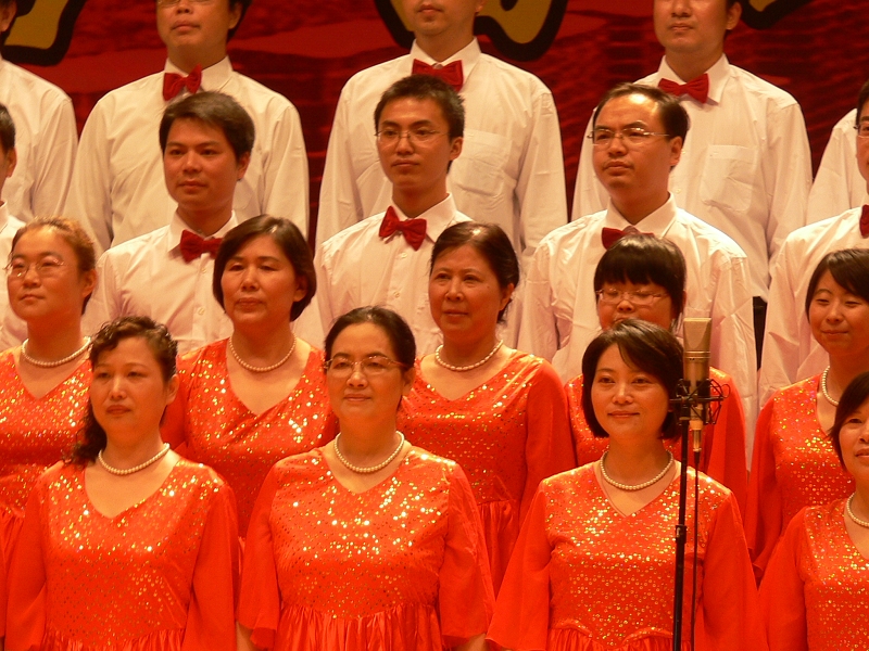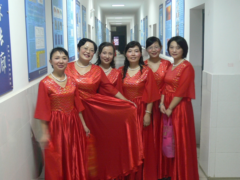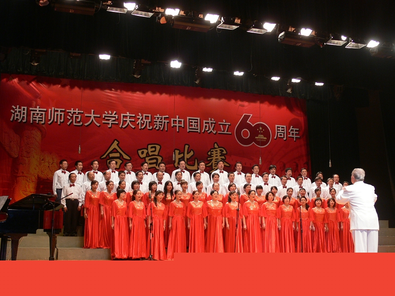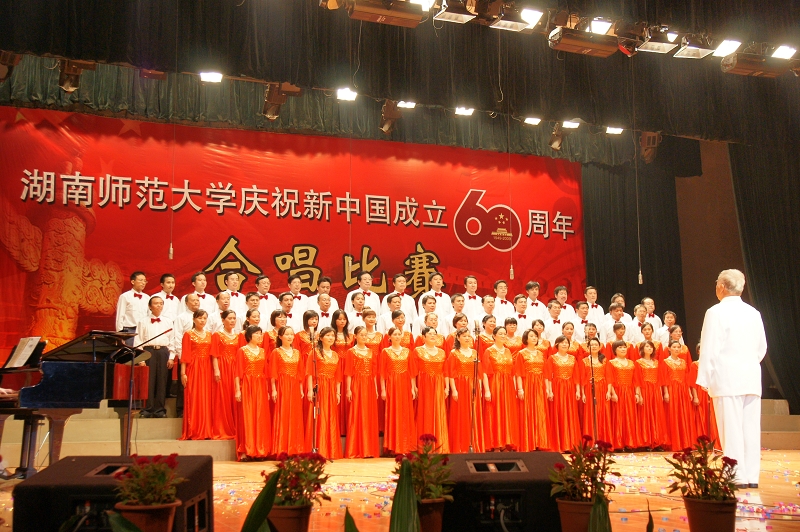 2009年9月25日晚,学院教职工在附中礼堂参加庆祝新中国成立六十周年合唱比赛,学院演唱曲目“保卫黄河”,在台上,教职工深情演绎,庆祝祖国的美好未来。