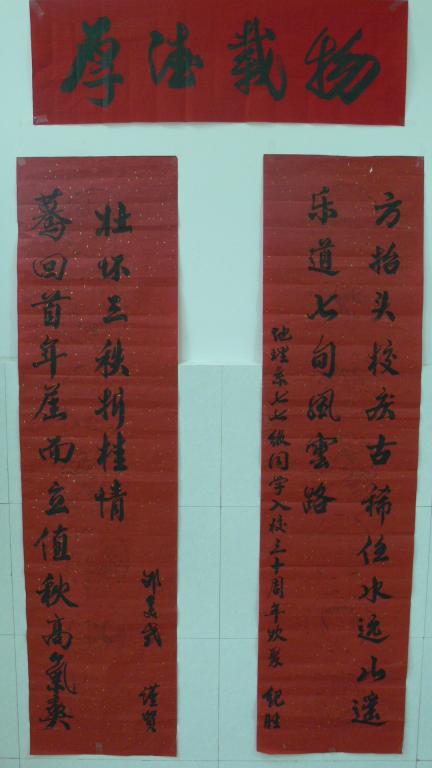 30年师生重聚首,绵绵喜雨颂金秋。刚刚送走参加学校建校70周年庆典的员工,学院又迎来了地理系77级学子的返校。11月1日,来自全国各地的地理系77级员工纷纷聚集母校,他们满怀深情的寻访往日的校园,探望年事已高的老系主任,与学院全体退休教师畅谈师生情谊。学子们尊师爱校的热情感染了白发苍苍的老教师。有的满怀激情的吟诗作词,有的献上亲手书写的对联。共同祝福学子前程锦绣,祝愿学校兴旺发达。