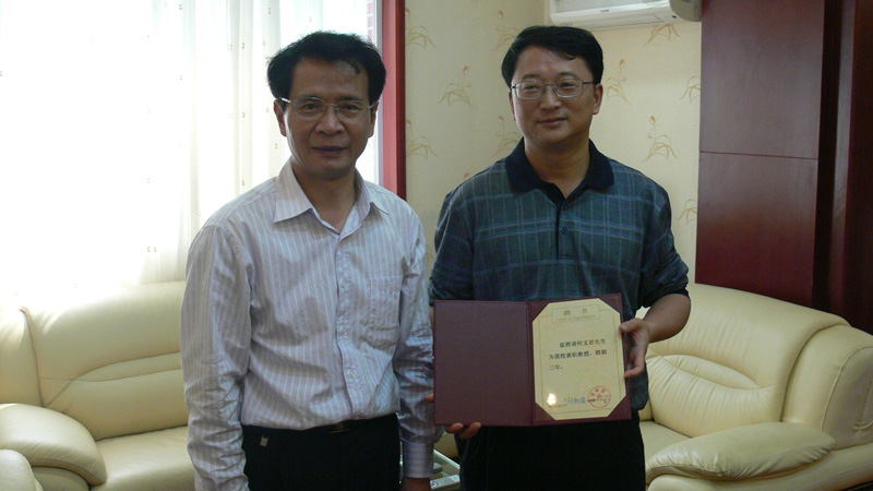 2008年10月20日,公司党委副书记卢岳华教授向何文君先生颁发兼职教授证书,何文君先生为公司86级研究生,现为郴州市委常委、市委秘书长、办公室主任、市直工委书记,在人文地理,区域规划等学科有较深的研究。