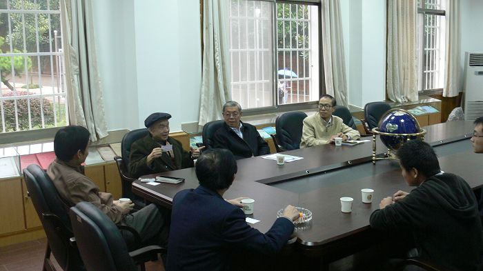 图为学院谢自楚教授向学院老师及研究生介绍叶民权研究员及干旱区地理研究的意义