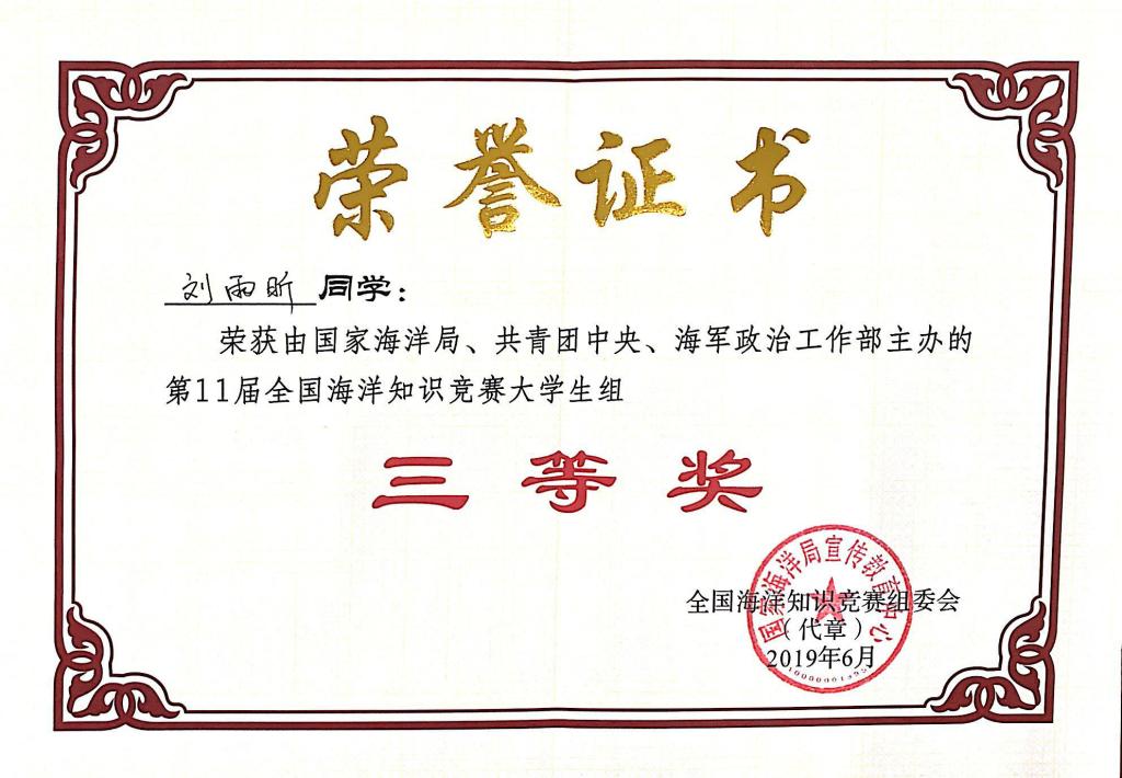 5月29日至6月5日,由国家海洋局、共青团中央、海军政治工作部主办,自然资源部宣传教育中心、海洋出版社、国家海洋局极地考察办公室、中国大洋事务管理局、海南广播电视总台承办的第十一届全国海洋知识竞赛老员工组总决赛在海南三亚启幕。公司2017级地理科学专业的刘雨昕参加比赛。