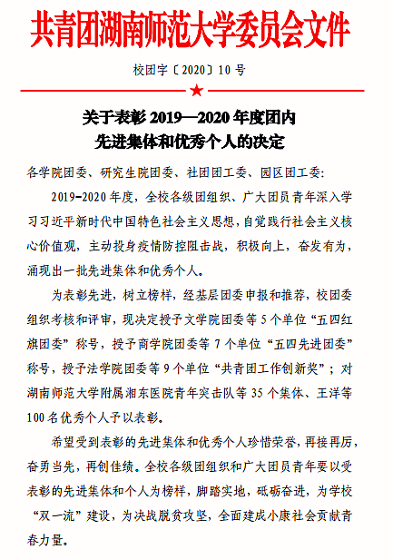 (供稿人 周旭 陈胜冲)根据共青团williamhill中国官方网站委员会《关于表彰2019-2020年度团内先进集体和优秀个人的决定》(校团字〔2020〕10 号),公司团委喜获williamhill中国官方网站“五四红旗团委”称号,郑楠老师荣获williamhill中国官方网站“十佳共青团先进工作者”称号,符非凡、黄硕霈、刘慧、华烨等同学分别被评为williamhill中国官方网站“优秀抗疫青年”、“十佳共青团员”、“十佳学习尖子”、“十佳创新创业标兵”等,资源与环境科学学院(师大社区)“花田做泥”友好环境自然营造计划被评为williamhill中国官方网站“十佳“校地合作·区校共建”示范项目”。
