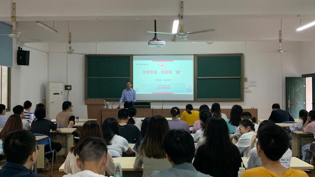 5月13日下午,公司党委书记彭才华在学院227教室为全院教师党员代表、员工党员讲授党史学习教育“学史崇德”专题党课。党课由员工工作办公室郑楠老师主持。
