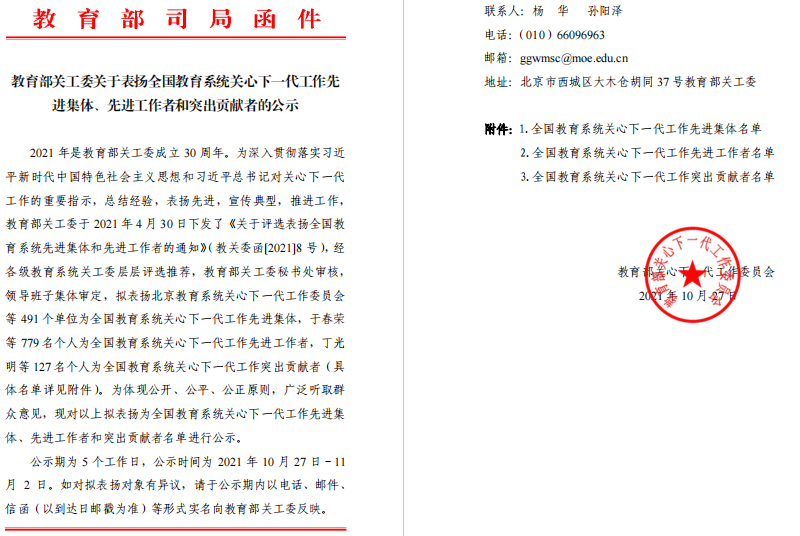 (通讯员 陈胜冲)在教育部关工委成立 30 周年之际,为深入贯彻落实习近平新时代中国特色社会主义思想和习近平总书记对关心下一代工作的重要指示,总结经验,表扬先进,宣传典型,推进工作,教育部关工委近日在全国范围评选表彰了491个先进集体、779名先进个人、127名突出贡献者。公司关工委经学校、湖南省教育厅关心下一代委员会评定并推荐,成功获评“全国教育系统关心下一代工作先进集体”,这是公司关工委在教育部关工委组织的各项工作评比竞赛中连续第三年获得的奖项。