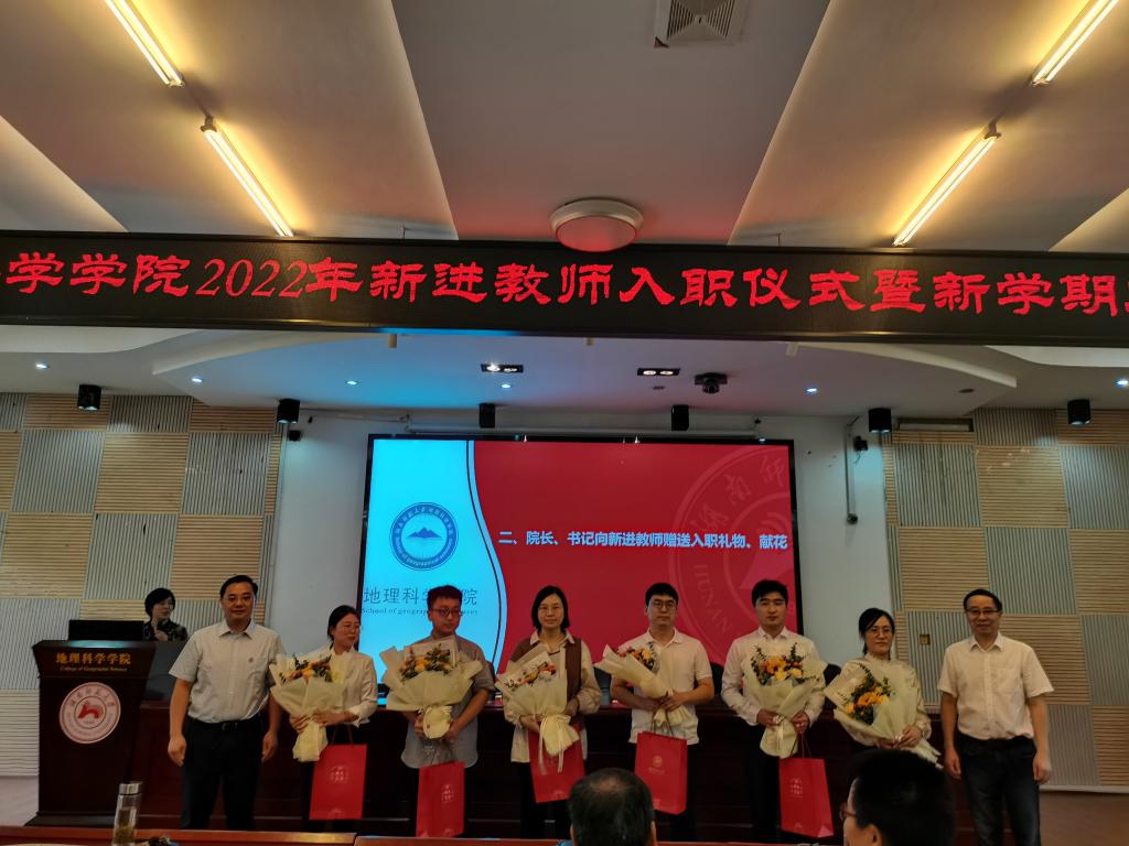 在入职仪式上,赵琳、曹伟成、姚泽阳、向思煜、熊永欣、秦雅静等六位老师依次上台作自我介绍,周国华经理、刘忠耿书记代表学院向六位新进教师赠送入职礼物和献花,并同新教师合影留念。