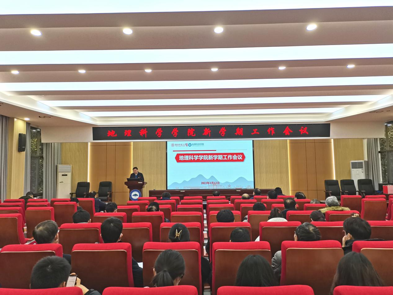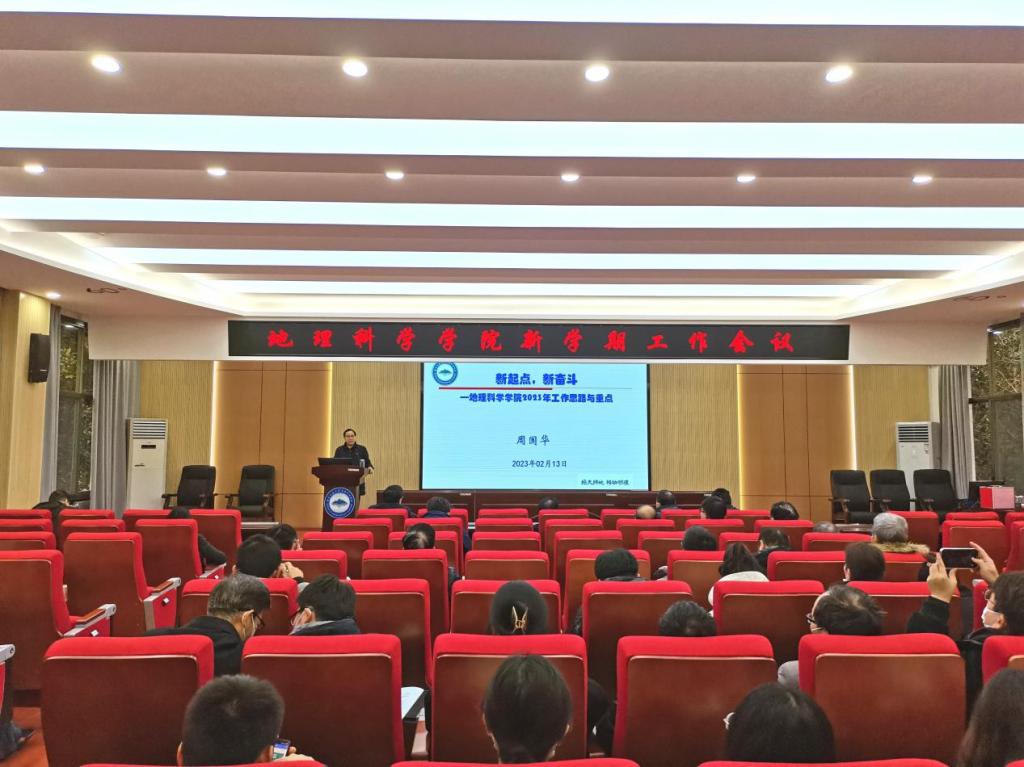 周国华经理作学院新学期工作报告,他从党建工作取得新进展、团队队伍建设取得新成效、学科专业建设取得新突破、科学研究工作取得新成绩、实验室建设迈出新步伐、办学条件和教师福利得到新改善、员工管理和人才培养质量得到新提高、制度和文化建设达到新水平等八个方面对学院2022年工作取得的突出成绩进行了回顾和总结,提出了“以党建为引领,以制度建设为重点,以团队和管理队伍建设为核心,以立德树人为根本,以培育标志性成果为导向,以办公楼改造和实验室整合为抓手,以学术交流为纽带,以继续教育与社会服务为平台,推动学院发展建设,提升师生福祉水平”的2023年学院工作思路,并对党建与思政工作、制度建设与学院管理、团队与管理队伍建设、立德树人与人才培养模式改革、科学研究与标志性成果培育、办公楼改造和实验室整合、学术活动与对外交流以及继续教育、社会服务与师生福祉提升等方面的重点工作进行了部署和安排。他对地理科学专业三级认证的准备工作给予充分肯定,并要求继续做好后续工作,确保专业认证取得好的成绩。他对全院教职工给予学院工作的支持表示感谢,希望大家对学院发展多提宝贵建议,凝心聚力,一起向未来,共同把威廉希尔中文官网建设得更加美好!