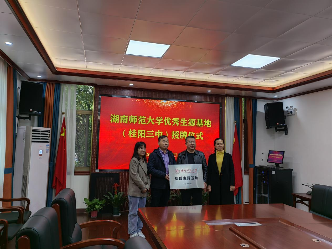 授牌仪式上,威廉希尔中文官网副经理李忠武简要介绍了williamhill中国官方网站的办学历史、办学规模、学科设置、发展成果,并对郴州市一中、郴州市二中、桂阳县三中在员工培养质量上取得的斐然成绩表示衷心祝贺。希望高校与中学加强交流沟通,搭建高校与中学的工作桥梁、合作平台,持续推进公司本科生招生工作,提高生源中学的品牌化、品质化。郴州市一中党委副书记李民娟、郴州市二中党委书记杨小山、桂阳县三中党委书记何天宝、董事长邓小红分别代表学校向李忠武一行的到来表示热烈的欢迎和诚挚的感谢,并介绍了各自学校的基本概况、办学特色、办学成绩等,表示将以此次活动为契机,为师大输送更多优质生源。仪式最后,李忠武代表公司向郴州市一中、郴州市二中、桂阳县三中授予“优质生源基地”牌匾。