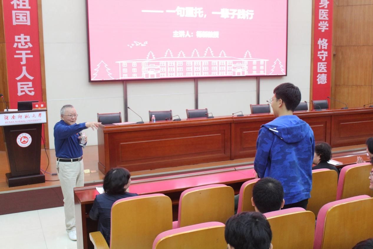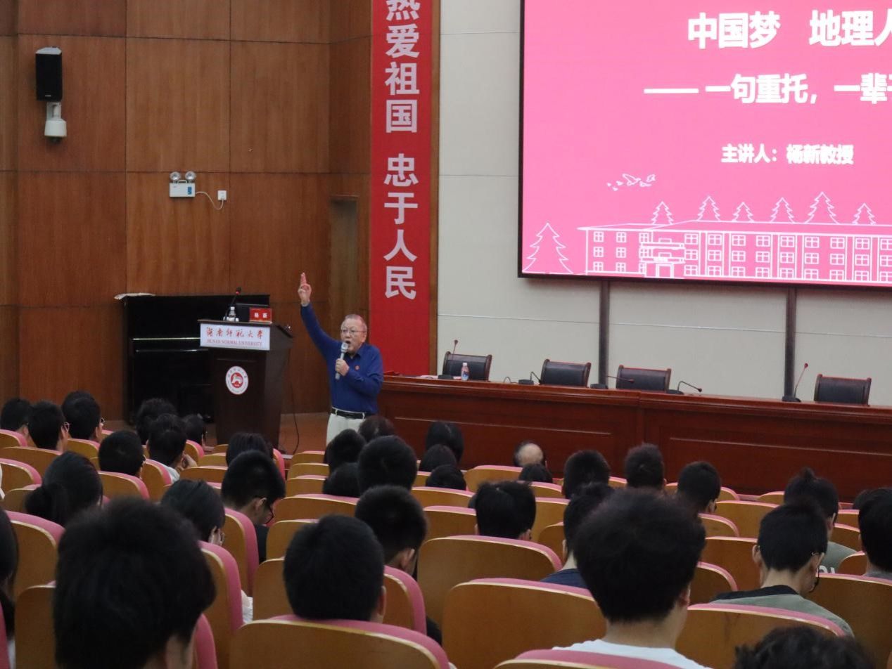 杨新教授以“一句重托,一辈子践行”为题,围绕“热爱祖国、热爱共产党、热爱地理、热爱员工”主线,带领员工感受中国文化的独特与魅力,激发员工对祖国的认同感;阐述共产党如何引领中国走向富强,教育员工热爱中国共产党;展示地理学科在学习与生活方面的紧密关系,引导员工热爱地理学科;通过师生问答互动,提升同学们对地理学科学习的兴趣;讲述个人教学经历,引起同学们对教育事业的共鸣。他希望同学们热爱专业、勤奋学习,争做国家栋梁。