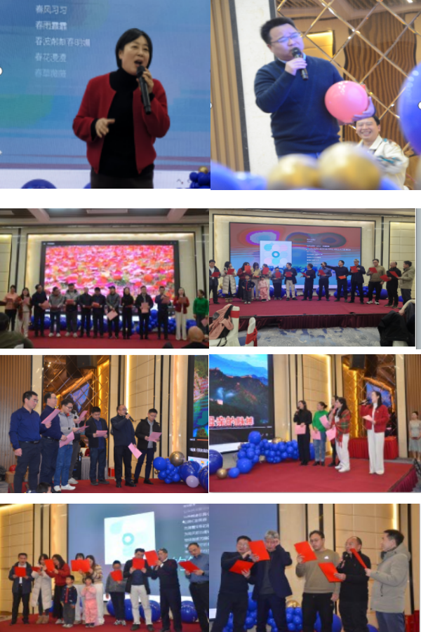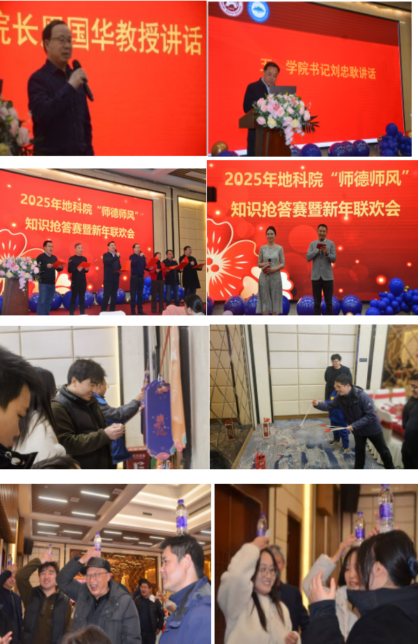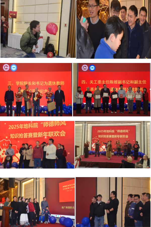 第三环节“联欢文艺会”暨“师德师风”知识抢答赛。城乡规划系表演方言诗词串烧《辞旧迎新》,同唱《我和我的祖国》,妙趣横生,情真意切;院工会自创《迎新年》三句半,激情演绎,引得现场掌声不断;新进教师接力演唱《情歌王》串烧歌曲,表达了对真爱、对生活的坚定执着与承诺;土地科学系曼舞轻唱《感恩的心》,传递温暖与深情;地理科学系引吭高歌《歌唱祖国》,扣人心弦;院领导集体上台表演诗朗诵《展望2025》,为全体教职工奉上了真挚而美好的祝愿;地理信息系以一曲《明天会更好》的婉转悠扬旋律将活动现场气氛推向高潮。在文艺表演过程中,穿插进行了多轮“师德师风”知识抢答赛,既是一场生动的师德师风教育课,也很好展示了学院教职工的师德师风素养。