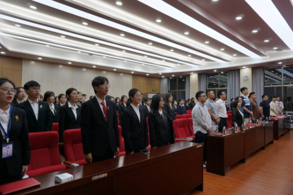 国歌奏响,全体人员庄严肃立,铿锵有力的歌声在会场回荡,校团委办公室主任阎威臻上台发言,向受表彰的先进集体和优秀个人致贺,向师生致以敬意与问候,肯定学院同学在主题团日活动中将共青团精神与专业融合的积极表现,赞誉受表彰者展现出共青团员良好风貌,号召同学们以榜样为引领,结合时代机遇与学科重要性,树立理想、勤奋学习、锤炼品德、积极实践。