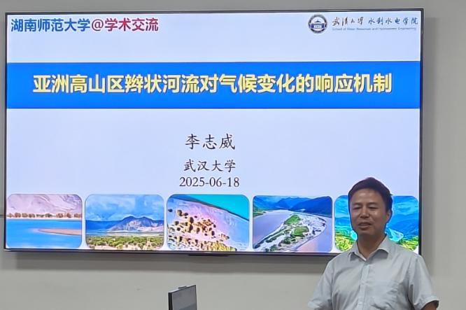 李志威教授作了题为《亚洲高山区辫状河流对气候变化的响应机制》的专题讲座(湖湘地理讲坛第五十六讲)。李教授首先从河流类型入手,系统介绍了辫状河流的定义、形成条件及其与气候、地貌之间的相互作用机制,并以青藏高原为典型区域,回顾了该地区辫状河流的形成演变过程。随后,他展示了辫状河流分布规律的定量描述方法,特别强调了不同植被覆盖强度条件下河道冲淤演替对辫状形态演变的影响机制。通过多个实地案例,系统探讨了高山区辫状河流对气候变化及人类活动的响应特征。整场讲座内容丰富、逻辑清晰,兼具理论深度与实践意义,获得了师生们的高度评价。