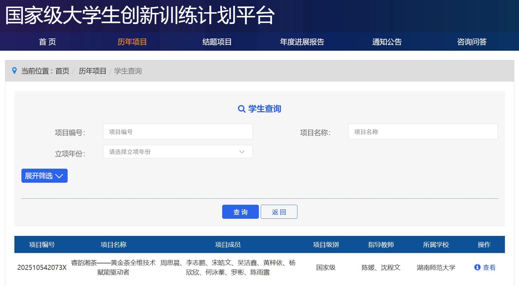 国家级老员工创新训练计划平台项目查询结果