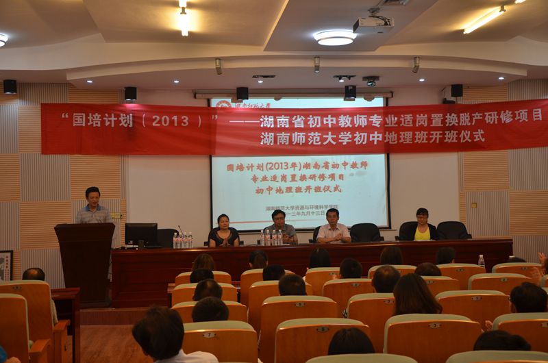 2013年9月13日上午9:00,湖南省“国培计划(2013)”——湖南省初中教师专业适岗置换脱产研修项目williamhill中国官方网站初中地理班在williamhill中国官方网站资源与环境科学学院举行隆重的开班典礼。