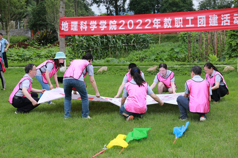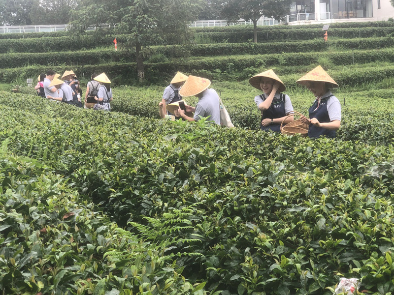 活动第二站为金井镇三棵树茶园采茶和团建活动。老师们顶着初夏的太阳,戴上采茶的围裙和蓑笠并提着竹篮,在一望无际绿意盎然的茶园中沉浸式体验采茶的乐趣和艰辛。十指翻飞间茶香袅袅,一枚枚嫩绿的茶叶芽逐渐填满了竹篓。随后,老师们聚集在草坪上,以各工会小组为单位开展了包括能量传递、重走长征路、精准投掷等项目在内的团建活动。活动场面既激情如火又温馨和谐,每个项目大家各抒己见的同时又密切配合与相互鼓舞,都发扬了无私奉献、团结协作的精神。在游戏的磨合中大家体会到了组织的核心作用和团队合作的力量,也在你追我赶的比赛中收获了团队成功的快乐。老师们沉浸在活动的喜悦兴奋中回味无穷。