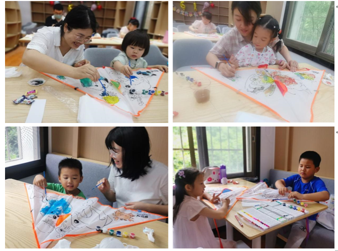 室外环节由家长伴随小朋友们放飞各自彩绘美饰的风筝,“折竹装泥燕,添丝放纸鸢”,活动气氛推向高潮。