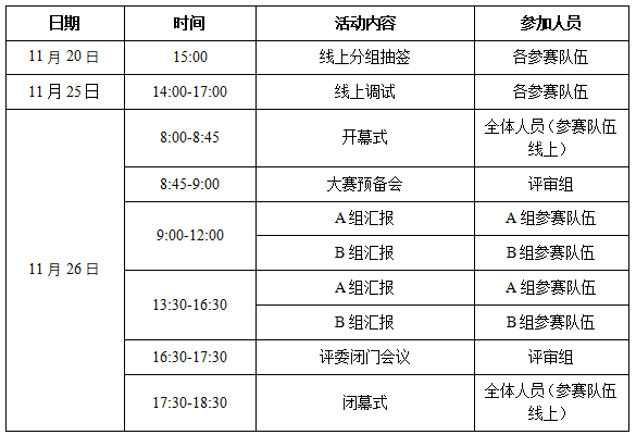 48支参赛队伍分为2组,11月20日线上抽签决定分组及出场顺序(抽签方式另行通知),11月25日各参赛队伍进行线上调试设备。11月26日决赛过程中,各参赛队伍需就作品进行汇报展示并回答专家提问;线上汇报展示时间不超过10分钟,专家提问和答辩不超过5分钟。