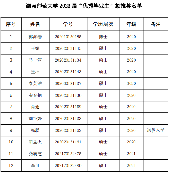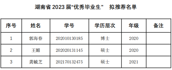 经本人申请、班级民主讨论、学院评审小组评审,公司拟推荐湖南省 2023 届“优秀毕业生”、williamhill中国官方网站 2023 届“优秀毕业生”名单如下,现予公示,请有异议者于 3月 20 日下午 5 点前到学院研究生办反映。