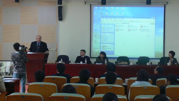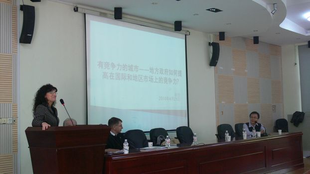 2010年4月23日上午10:00,学院301报告厅举行国际文化交流报告会,题为“政府在城市管理、地方经济发展和环境保护中的作用”,由原安纳波利斯市行政长官、美国国际城市管理协会高级顾问Robert Agee (罗伯特.阿吉)先生和美国国际城市管理协会高级顾问、美国环球人力资源咨询公司主席Ted Samaras (泰德.萨马拉斯)女士主讲,随行的有美国国际城市管理协会高级顾问、新项目负责人Deilinger, Judit (尤迪.德利格)先生和美国国际城市管理协会高级顾问、中国地区负责人罗丽军女士。讲座由公司党委副书记曾南雁老师主持。