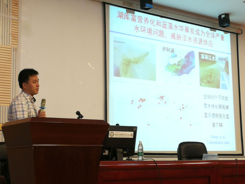 报告围绕湖泊变暖、湖泊水下变暗及湖泊生态系统退化三个核心问题,从研究背景与意义、国内外研究态势与热点、主要研究进展三个方面展开。内容从宏观到微观、从国内到国外、从平原浅水湖泊到高原深水湖泊、从传统的湖泊定位观测到荧光分析、遥感监测等现代技术手段的应用,开展了格局—过程耦合—响应机制的综合系统研究。报告内容丰富多彩,由表及里、由浅入深、通俗易懂,令人受益匪浅。会后的互动环节里,张运林研究员回答了相关教师、研究生和本科生代表的提问,并对学弟学妹们前往中科院南京地理与湖泊研究所继续深造表示热烈欢迎!