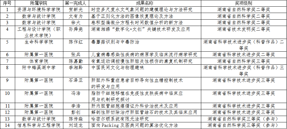 (供稿 科学技术处 资环学院)6月10日上午,湖南省科技创新奖励大会在长沙召开。公司14项研究成果荣获湖南省人民政府表彰,其中包括湖南省自然科学奖二等奖3项、三等奖3项(其中参与2项);湖南省技术发明二等奖1项;湖南省科学技术进步奖二等奖2项,三等奖5项,获奖总数创公司历年新高。公司贺新光(第一完成人)、章新平、秦建新、吴华武、陶俐芝团队的研究成果《时空多尺度水文气象问题的建模理论与方法研究》荣获湖南省自然科学奖二等奖。