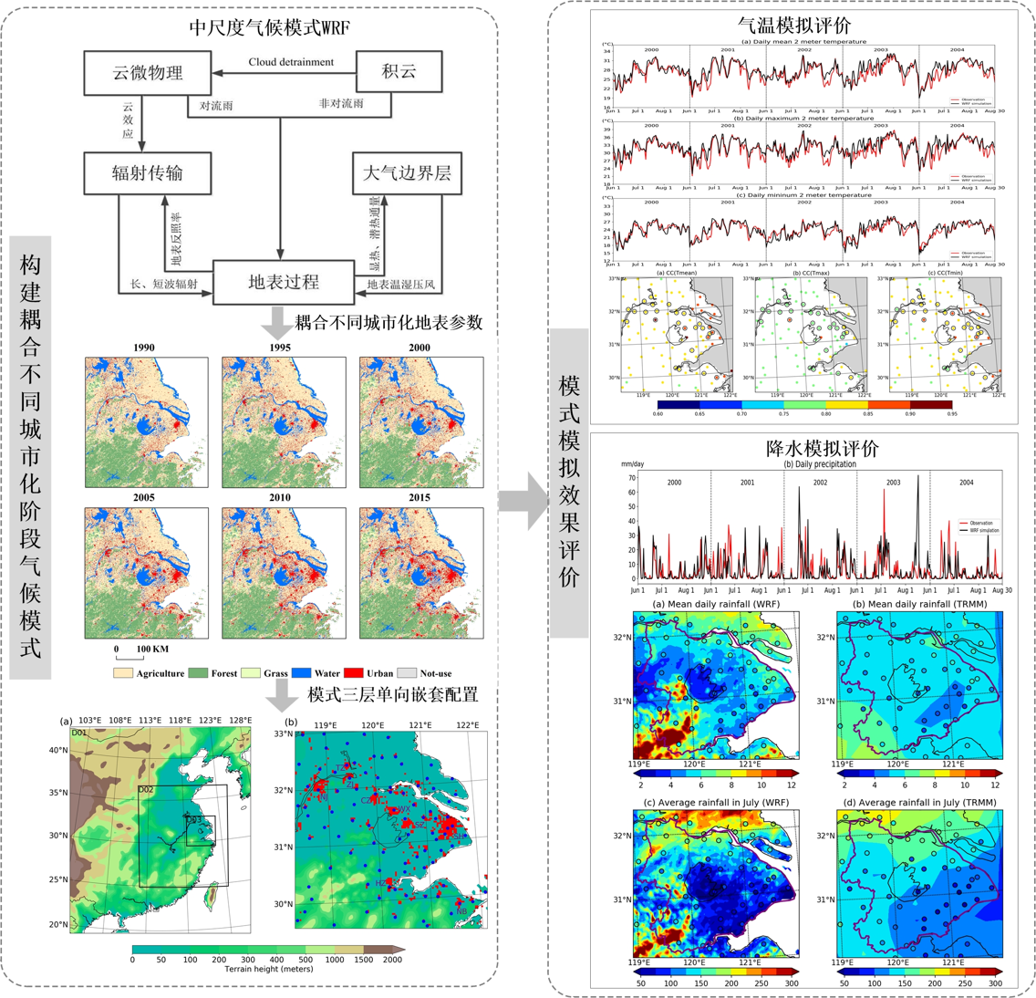 构建了考虑不同城市化阶段的陆-气耦合天气模式。借助长序列观测数据和数值模拟方法,发现长三角地区城市化导致城市地区夏季平均气温升高0.75˚C,随着城市扩张城市热岛效应在加剧。