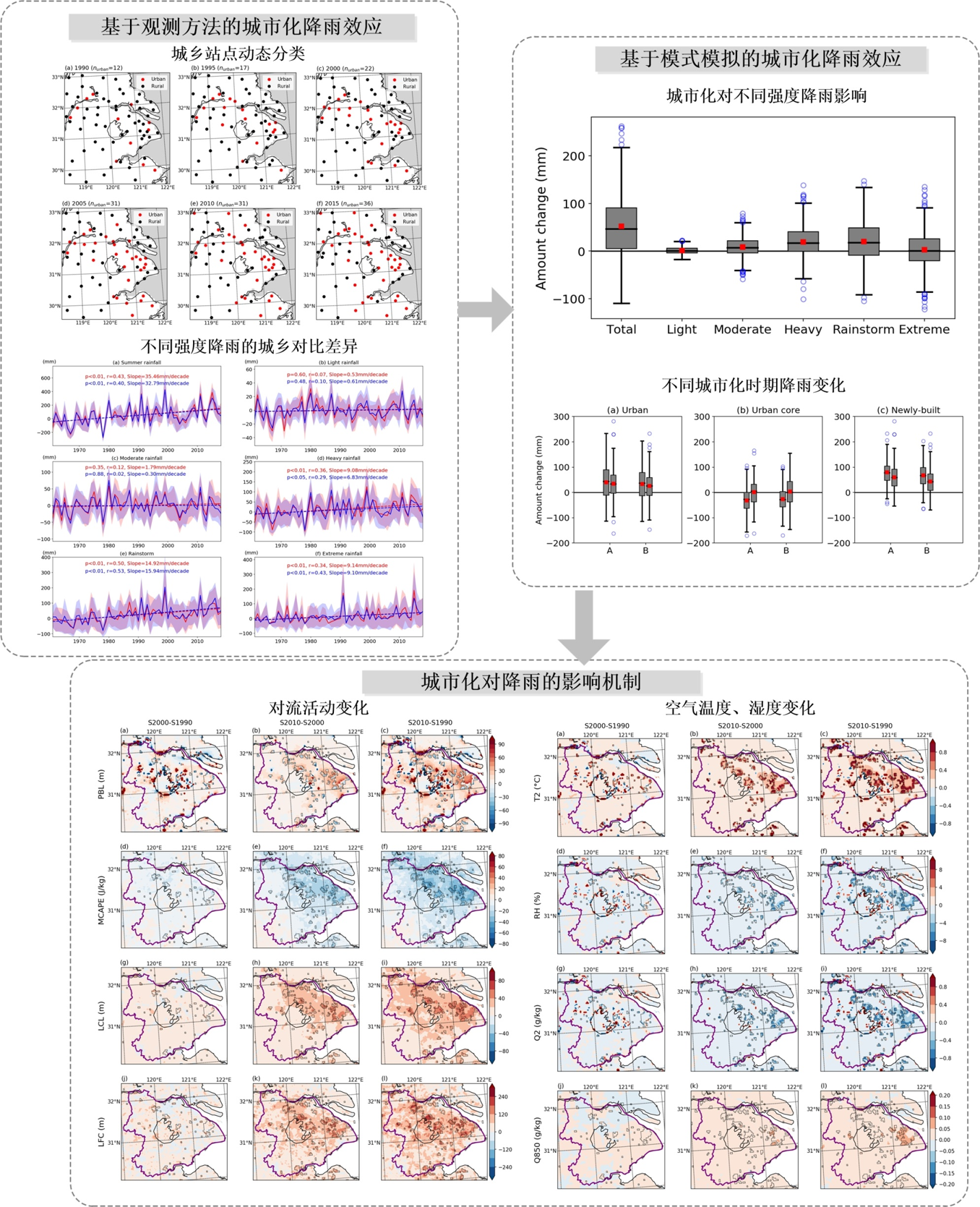 基于观测和数值模拟,系统揭示了城市化对降雨的影响特征、规律和机制。发现长三角城市化对强降雨的增雨效应较为显著,但随着城市化进一步扩张,城市化后期抑制降雨因子(湿度和MCAPE)增强,城市增雨效应在减弱。