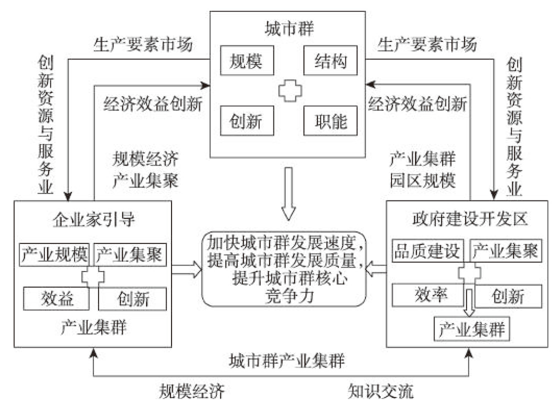 城市群是产业集群和开发区发展的空间载体;开发区是城市群创新的高地和产业集聚集群的重要场所;产业集群是推动开发区和城市群发展的重要驱动力。产业集群与开发区共享着城市群的资源、服务和市场,开发区通过产业集聚与创新,产业集群通过产业链延伸、耦合与创新,与城市群相互作用,协同发展(图2)。