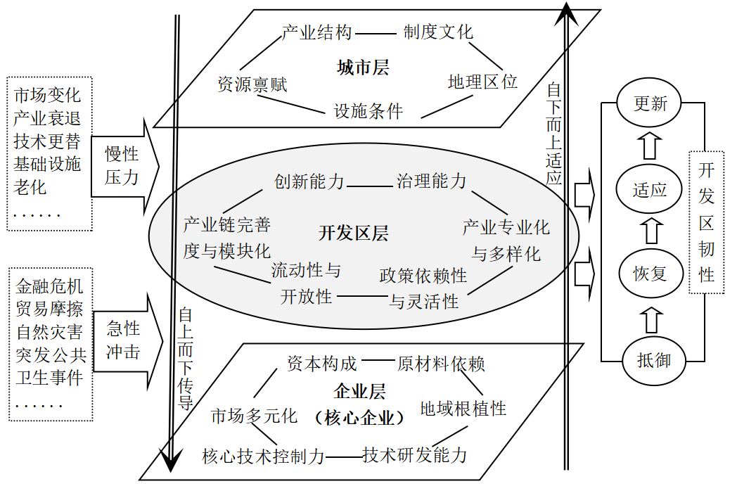 开发区韧性受区域、城市、开发区本身及企业(核心企业)多尺度多要素的综合影响。面对外部冲击与扰动,各尺度要素相互作用反馈,通过自上而下的韧性传导和自下而上的韧性适应,共同推动开发区韧性的形成与提升(图4)。