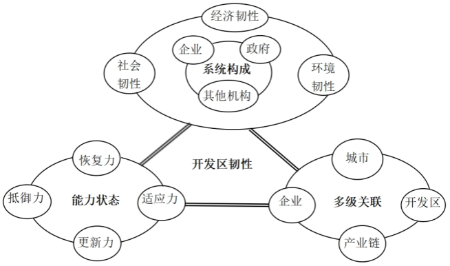 基于复杂适应系统理论和演化韧性视角界定开发区韧性的内涵。开发区韧性为多尺度多层级多元主体共同作用下的经济韧性、社会韧性、环境韧性的协同集合;表现为开发区应对外界扰动所呈现出的抵御、恢复、适应和更新的综合能力(图3)。