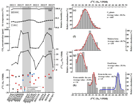 2021年1月至2022年10月,研究团队对湘中千佛洞(QF)洞内人工灯光下生长的3种蕨类植物叶片样品、洞外生长的3种蕨类植物(与洞内相同的有2种)叶片样品和洞内空气CO2进行了大致的逐月采集,并进行了δ13C分析测试。同时对该洞穴内的空气温度、相对湿度、CO2浓度进行了连续监测。结果发现,QF洞内环境(空气相对湿度常年接近100%,温度常年恒定在当地年均温附近)相对稳定(图1a),但洞内空气CO2浓度(图1b)及其δ13C(图1c)具有明显的季节变化特征,夏季CO2浓度高(> 2000 ppm;现今正常大气CO2浓度约为410-420 ppm)且其δ13C较为偏负(约-20‰至-23‰;现今正常大气CO2的δ13C约为-8‰),这显然与夏季洞穴顶部植物根系呼吸作用更强有关。QF洞内3种蕨类植物的δ13C整体偏负于-36.5‰,最负值为-50.5‰,均值约为-44.7‰,其同样在夏季整体较为偏负(图1d)。无论是与全球分布的现代C3植物(图1e)和蕨类植物(图1f)、文献中报道的化石蕨类植物(图1g),还是与QF洞外生长的蕨类植物(图1h)相比,QF洞内蕨类植物δ13C值都是最为偏负的,这主要应该是由洞内空气CO2浓度相对较高且其δ13C值较为偏负造成的。