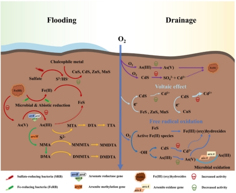 图1 淹水和排水条件下稻田土壤中砷和镉的关键生物地球化学过程