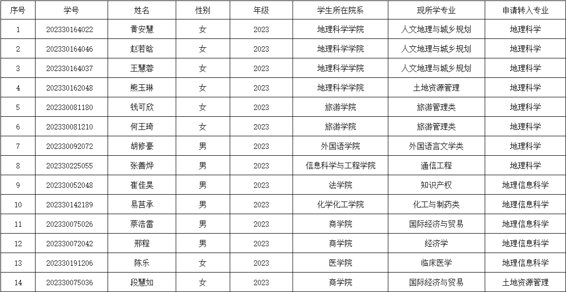 本次公司共收到14名员工提交的转专业申请,经审查,有黄安慧等14名同学通过报名资格审查,现将名单予以公示。公示期为2024年9月3日至2024年9月5日。