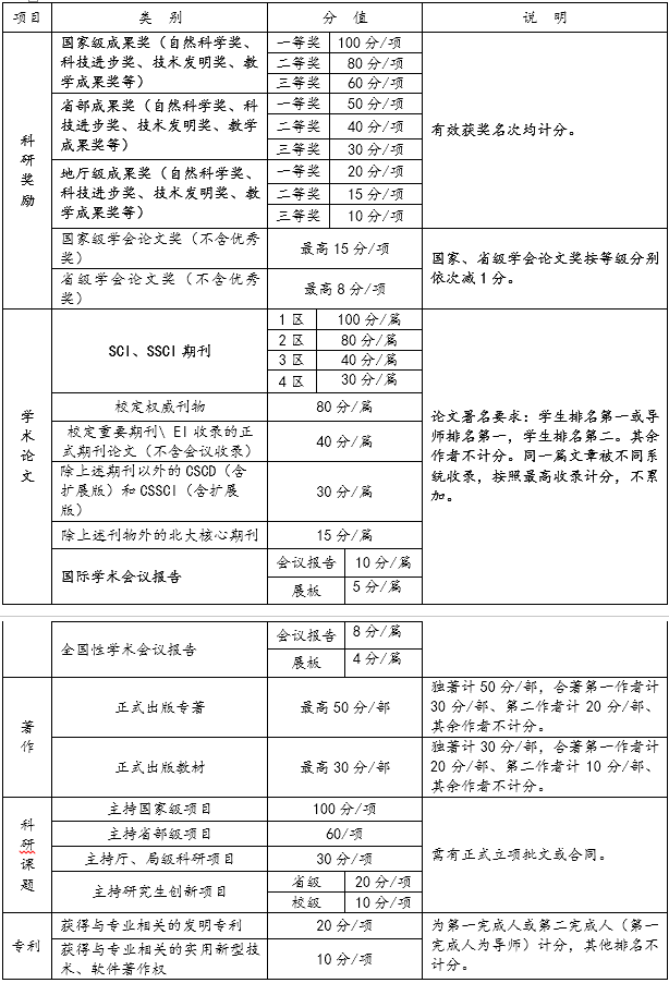 说明:研究生第二学年学业奖学金评定依据是研究生第一学年的思想品德、课程学习成绩、科研业绩、社会实践与课外科技活动、文体与公共活动等情况进行评定。研究生第三学年学业奖学金评定依据是研究生第二学年的思想品德、课程学习成绩、科研业绩、社会实践与课外科技活动、文体与公共活动等情况进行评定。 |