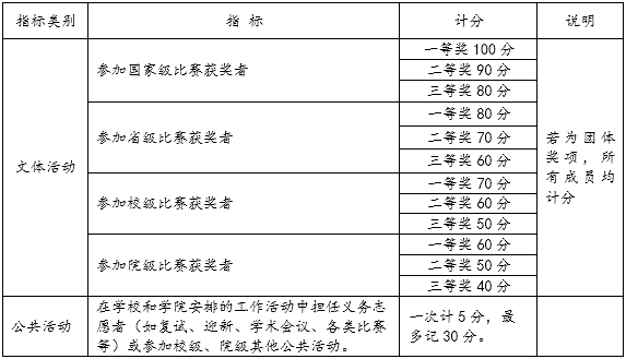 注:参评学年内,各类奖励、表彰需有正式文件或证书;公共活动以实际记录名单为准;同一行为受不同级别奖励(表彰),以最高级别奖励(表彰)计分,不累计。文体及公共活动为所有项目的累计得分,超过100分的以100分记。