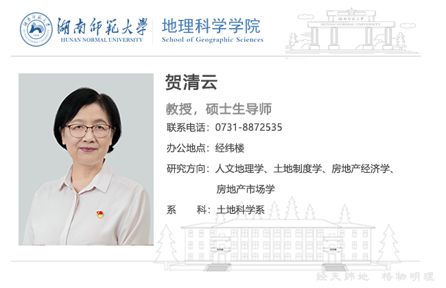 贺清云,女,湖南省政府参事,威廉希尔中文官网二级教授,博士生导师, 现任湖南省房地产经济研究会会长,兼任武汉大学中国中部发展研究院副秘书长。长期从事本、硕、博人文地理学、城市经济学、区域经济学、房地产经济学、国外房地产惯例等课程的教学与科研工作。近年来主持国家自然基金课题1项,主持国家发改委委托项目10项,主持湖南省发改委、省科技厅等重大、重点项目4项,主持各类横向课题30余项。发表各类学术论文70余篇,出版著作、教材10余部。2014年任湖南省人民政府参事以来,共完成省参事室和国务院参事室下达课题和撰写各类参事建言约20余项。