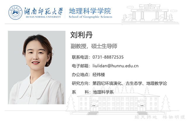 刘利丹,女,副教授,硕士生导师,2017年毕业于东北师范大学,获自然地理学博士学位,现主要从事第四纪环境演化、古生态学、地理教学论等教学与科研工作。主持和参与国家自然科学基金、国家环保公益性行业科研专项、湖南省自然科学基金、湖南省教育厅优秀青年基金等多项科研项目,目前以第一作者身份在《Catena》、《European Journal of Soil Science》、《Frontiers in Plant Science》、《Ecological Indicators》、《Boreas》、《Quaternary International》、《第四纪研究》等国内外重要期刊发表论文多篇,现任湖南省中小学教团队格考试面试考官(地理)等。