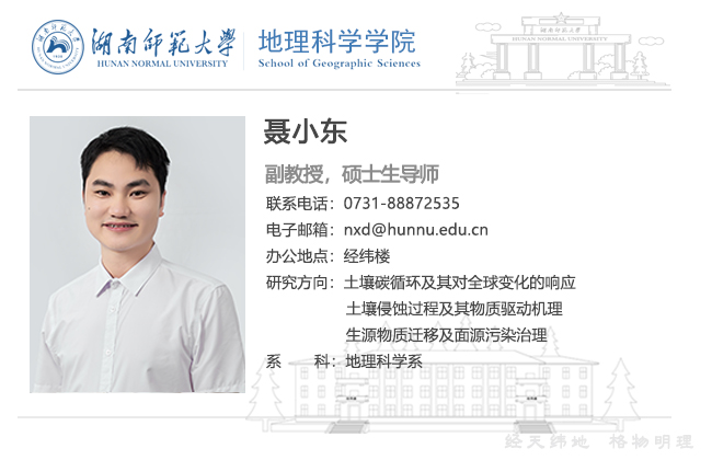 聂小东,男,博士,副教授,硕士生导师。2017年毕业于湖南大学,获工学博士学位。2017年-2019年于广东省生态环境技术研究所开展博士后研究工作。曾以研究助理身份在香港中文大学地理与资源管理学系开展交流学习及科研工作。主要从事生源要素循环及其生态环境效应研究。目前,主持和参与了国家自然科学基金、中国博士后科学基金、国家重点研发专题等多项科研项目;近年在Soil Tillage Research, Catena, Earth-Science Reviews, Journal of soils and sediments,《土壤学报》等国内外主流期刊发表论文20余篇,参编专著1部。