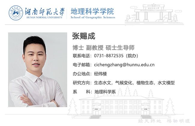 张赐成,男,1988年生,威廉希尔中文官网副教授。2018年博士毕业于北京师范大学,2018年至2021年在清华大学水利系从事博士后研究。主要研究领域(1)探究植物-水分之间的相互关系,植物如何响应和适应水分胁迫;(2)研究水循环过程对气候变化的响应,不同气候变化情景下,全球蒸散发和径流如何变化,以及植被的生态过程如何影响蒸散发和径流变化。近五年,主持国家自然科学基金(青年)与湖南省自然科学基金项目(青年),参与国家自然基金重大项目、国家自然科学重大研究计划、青海省科技厅重大项目等多项科研项目;在Journal of Hydrology, Geophysical Research Letters, Plant and Soil, Science of Total Environment等国际著名期刊发表SCI论文20余篇;担任Journal of Hydrology、Water Resource Research以及Plant and Soil期刊审稿人。2018年获北京师范大学优秀毕业生