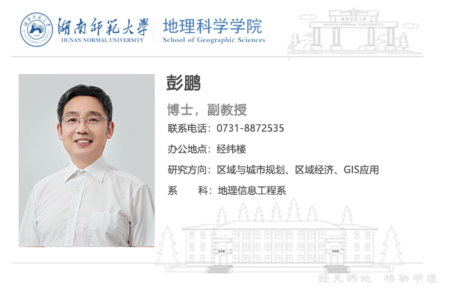 彭鹏,理学博士,副教授,人文地理学硕士生导师。本、硕、博分别毕业于williamhill中国官方网站、南京大学和华东师范大学。主要从事区域与城市规划、区域经济、GIS应用等领域的教学与研究工作。现主持省教育厅项目1项,参与国家或省级科研项目10余项;发表学术论文20余篇,主编或参编专著及教材5部;获湖南省科学技术进步三等奖、湖南科技论坛学术论文一等奖、湖南省首届教育信息化论文二等奖、williamhill中国官方网站第一届青年科技论坛优秀论文一等奖、williamhill中国官方网站教学优秀奖。