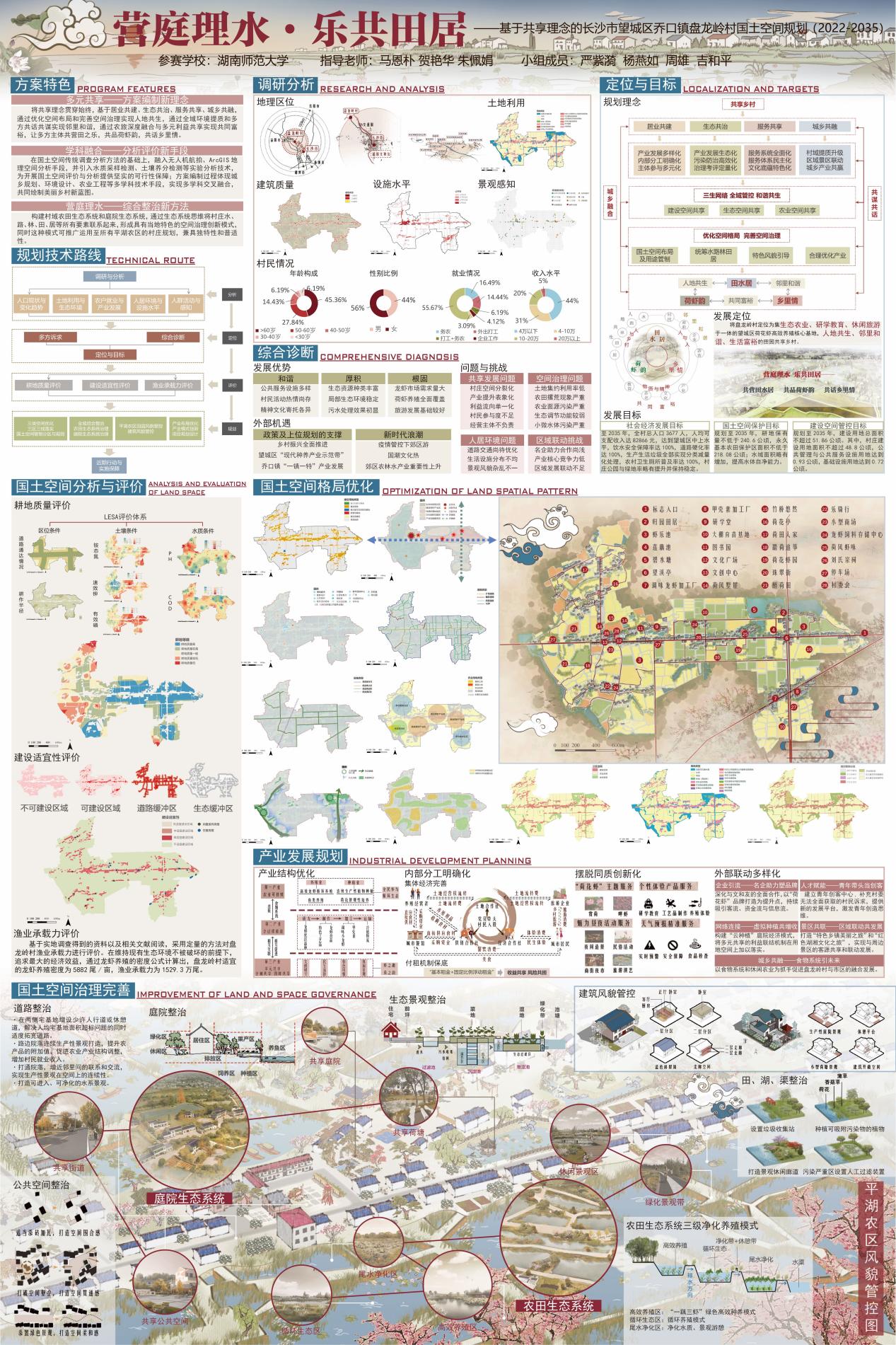 参赛作品以乡村振兴和城乡融合战略为背景,运用多学科交叉融合技术方法,基于“居业共建”“生态共治”“服务共享”“城乡共融”的“共享乡村”理念,提出“集生态农业、研学教育、休闲旅游于一体的望城区荷花虾高效养殖核心基地”战略定位和“共营田之乐、共品荷虾韵、共话乡里情”的发展路径,以及“人地共生、邻里和谐、共同富裕”的田园共享乡村目标,助力美丽乡村建设。