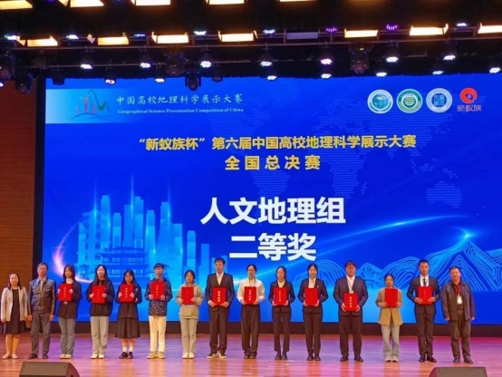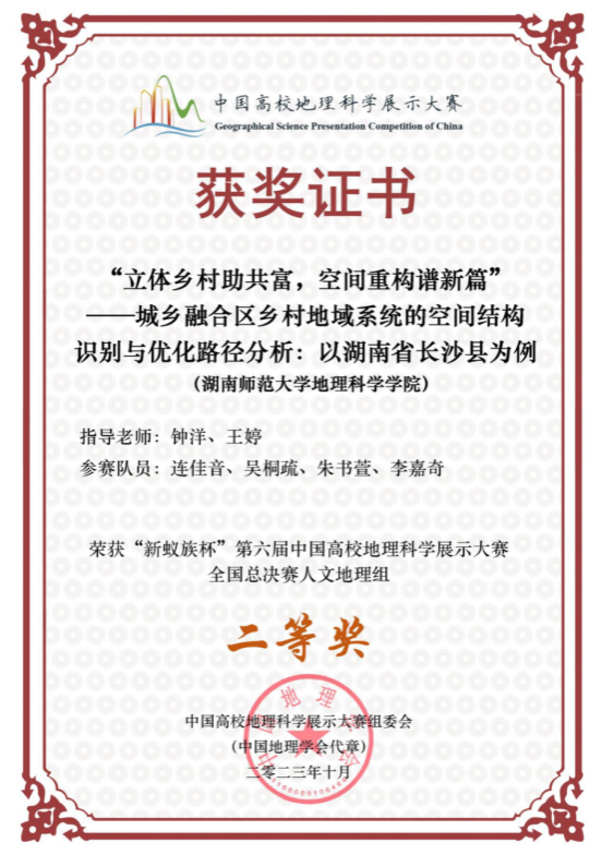 (供稿人 钟洋)2023年27日-29日,“新蚁族杯”第六届中国高校地理科学展示大赛全国总决赛在西北大学举行,经过紧张激烈的角逐,由公司城乡规划系朱佩娟老师指导的,公司2021级人文地理与城乡规划专业张宏生、亓势强、唐姿睿三位同学共同完成的作品《红色旅游地可持续发展评价体系的构建与实证——以长征国家文化公园沿线74个市州为例》以及由公司城乡规划系钟洋老师、土地科学系王婷老师指导的,公司2021级地理科学专业连佳音、2020级地理科学专业吴桐疏、朱书萱、2020级土地资源管理专业李嘉奇四位同学共同完成的作品《“立体乡村助共富,空间重构谱新篇”——城乡融合区乡村地域系统的空间结构识别与优化路径分析:以湖南省长沙县为例》双双荣获人文地理组“国家二等奖”的好成绩。