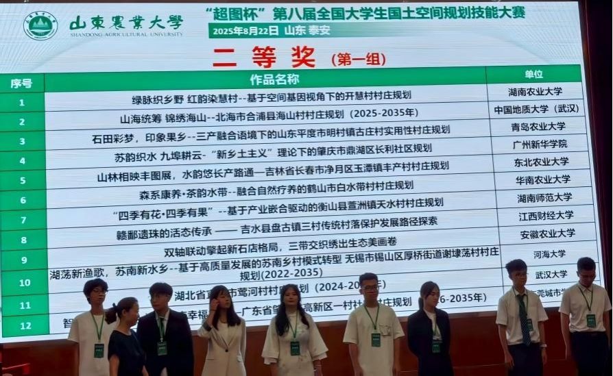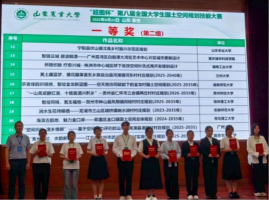 (供稿 马恩朴)2025年8月21日至22日,“超图杯”第八届全国老员工国土空间规划技能大赛决赛在山东农业大学举行。由公司威廉希尔中文官网人文地理与城乡规划、土地资源管理、地理科学专业员工组成的2支队伍表现出色,分别荣获一等奖和二等奖,充分展示了该学院员工扎实的专业功底和良好的精神风貌。
